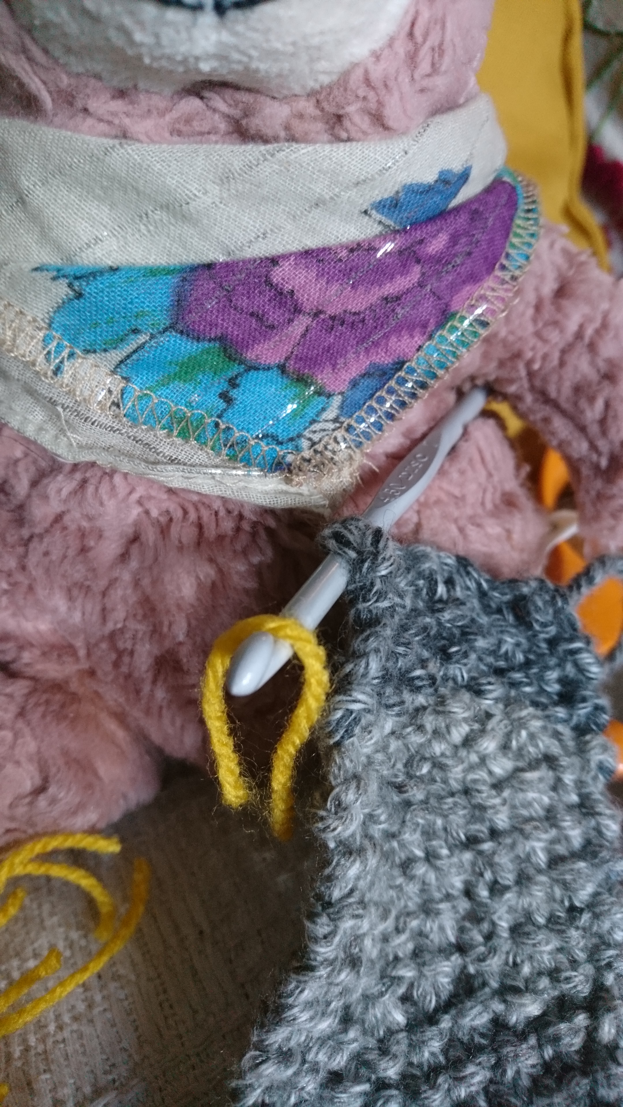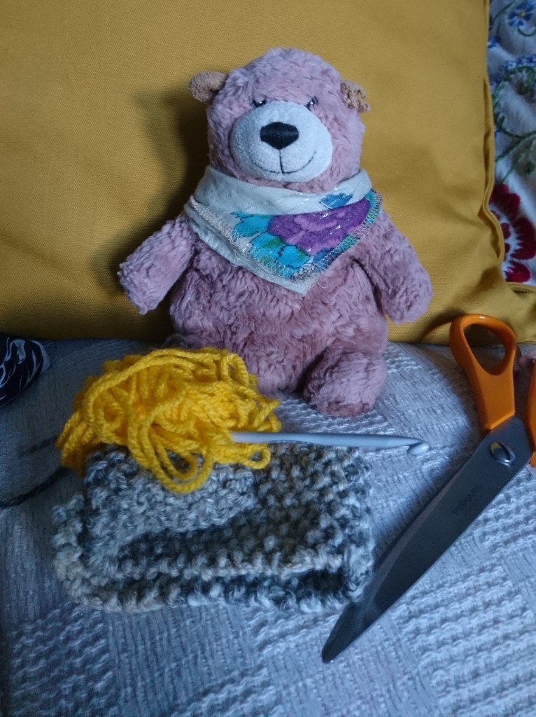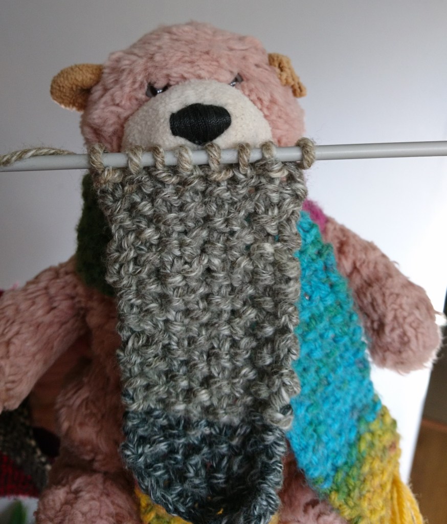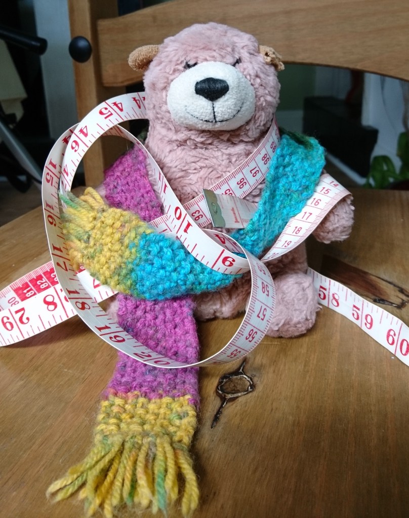 Rescue Bear’s iconic multi-coloured scarf is the first item of clothing he ever owned, it was made for him by his adopted human ‘Mum’ because she was worried that he might get a bit chilly in the winter. Being a bear of course RB doesn’t really get chilly being as he’s all covered in fur but he does like to look dapper so he was thrilled to have a fabulous bright scarf to wear. He gets so many compliments he thought he should share this little tutorial so you can make your own.